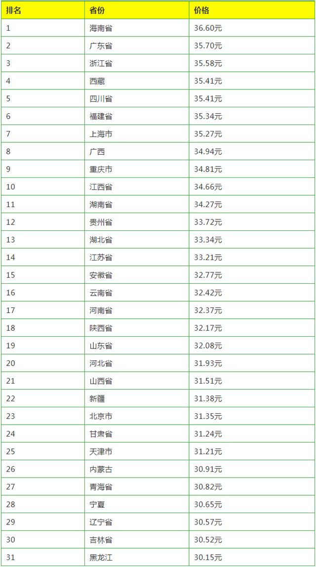 - 根據今日所監測到的全國各地區的外三元生豬價格,經過整理排序,得到下表。由表中可看出,價格最高的省份為海南省,價格最低的省份為黑龍江,本省位居第二。且得出榜首與榜尾的