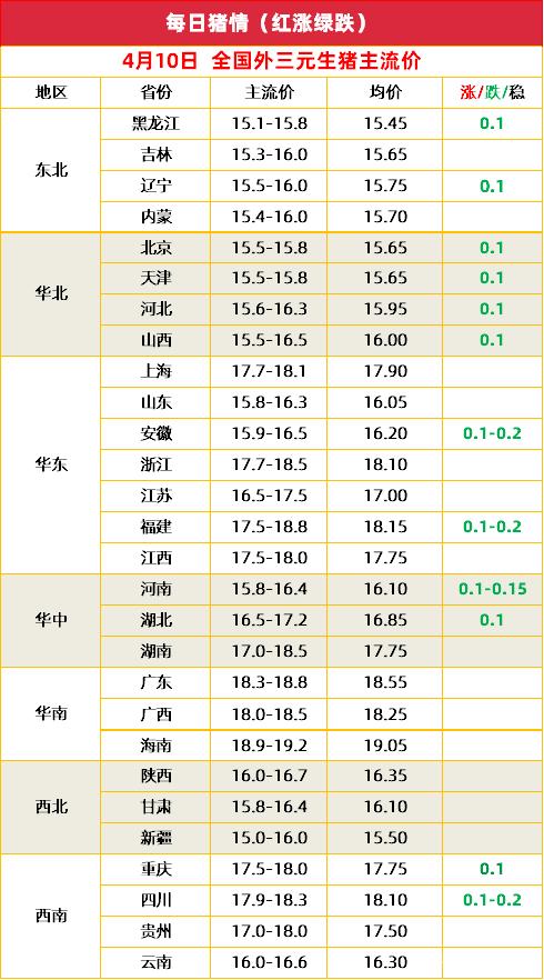 4月10日全國(guó)外三元生豬均價(jià)為16.88元/斤,較昨日的16.99元/斤,下滑0.11元/斤。