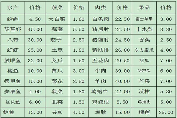 表中數(shù)據(jù),豆角、黃瓜、藕價(jià)格小幅下降;西紅柿、菜花、茭瓜、小白菜、茼蒿、西蘭花、菠菜價(jià)格小幅上漲。
