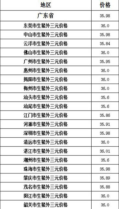 今日(4月21日)我國養豬主要區域的平均生豬價格約為16.44元/斤,相比昨天下跌了0.03元/斤。廣東省下跌幅度為0.12,那么我們來看看全省各地的生豬價格。(下表價格單位為:元/公斤)