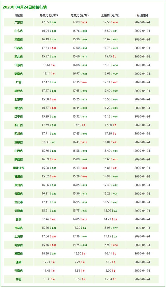 我們監測到了今日國內各省市的外三元豬價、內三元豬價以及土雜豬價的價格行情。價格走勢有上升有下行,不過幅度很小,總體還是較為平穩。以下為4月24日的豬價行情表,供大家參看。