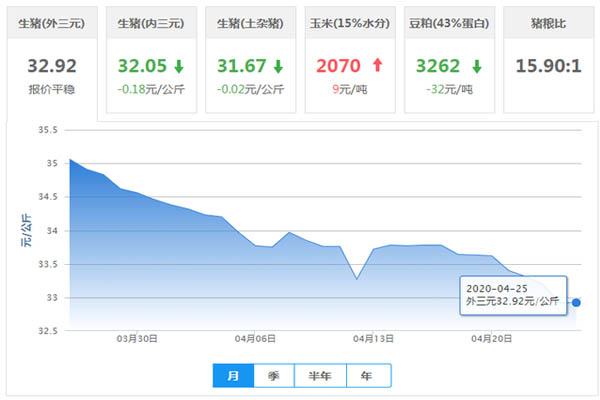 圖中可以看到,今日(4月25日)全國(guó)外三元生豬的平均價(jià)格為32.92元/公斤,較昨日持平;而內(nèi)三元生豬平均價(jià)格則是32.05元/公斤,相比如昨日是下跌了的;還有土雜豬的平均價(jià)格相比于昨日也是下跌了,下跌后今日價(jià)格為31.67。