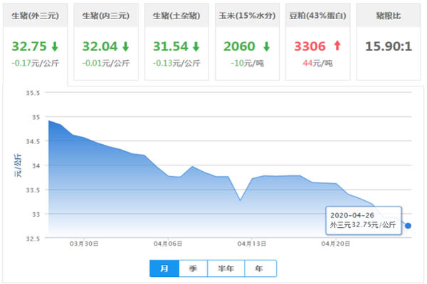 所以,國內(nèi)今日(4月26日)生豬均價(外三元)為32.75元/公斤,價格較昨日下跌0.17元/公斤;內(nèi)三元生豬均價為32.04元/公斤,價格較昨日下跌0.01元/公斤;土雜豬生豬均價為31.54元/公斤,價格較昨日下跌0.13元/公斤。