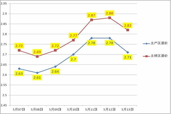 主產區雞蛋均價2.71元/斤,較昨日下跌0.07元/斤;主銷區雞蛋均價2.82元,較昨日上漲0.06元/斤;主要批發市場雞蛋均價3.17元/斤,較昨日跌0.03元/斤。雞蛋價格走勢圖如下: