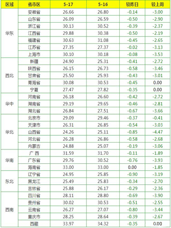 - 根據系統監測顯示:今日(5月17日)全國外三元生豬均價為26.81元/公斤,較昨日下跌0.13元/公斤;內三元生豬均價為均價為25.57元/公斤,價格較昨日下跌0.13元/公斤;土雜豬生豬均